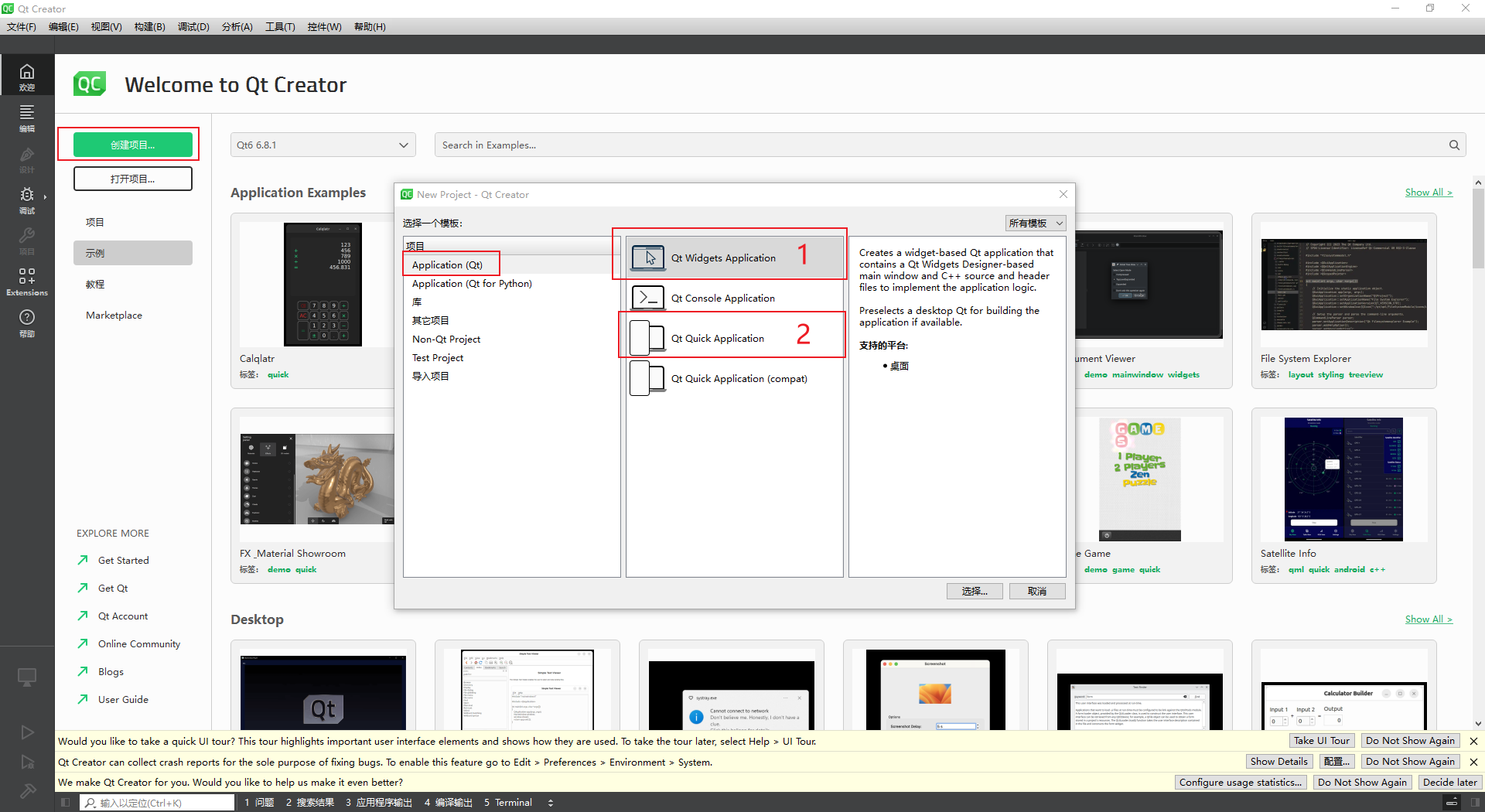 在这里我们点击创建项目,选择Application(Qt),接下来我们有两个选择,一个是Qt Widgets Application和Qt Quick Application。