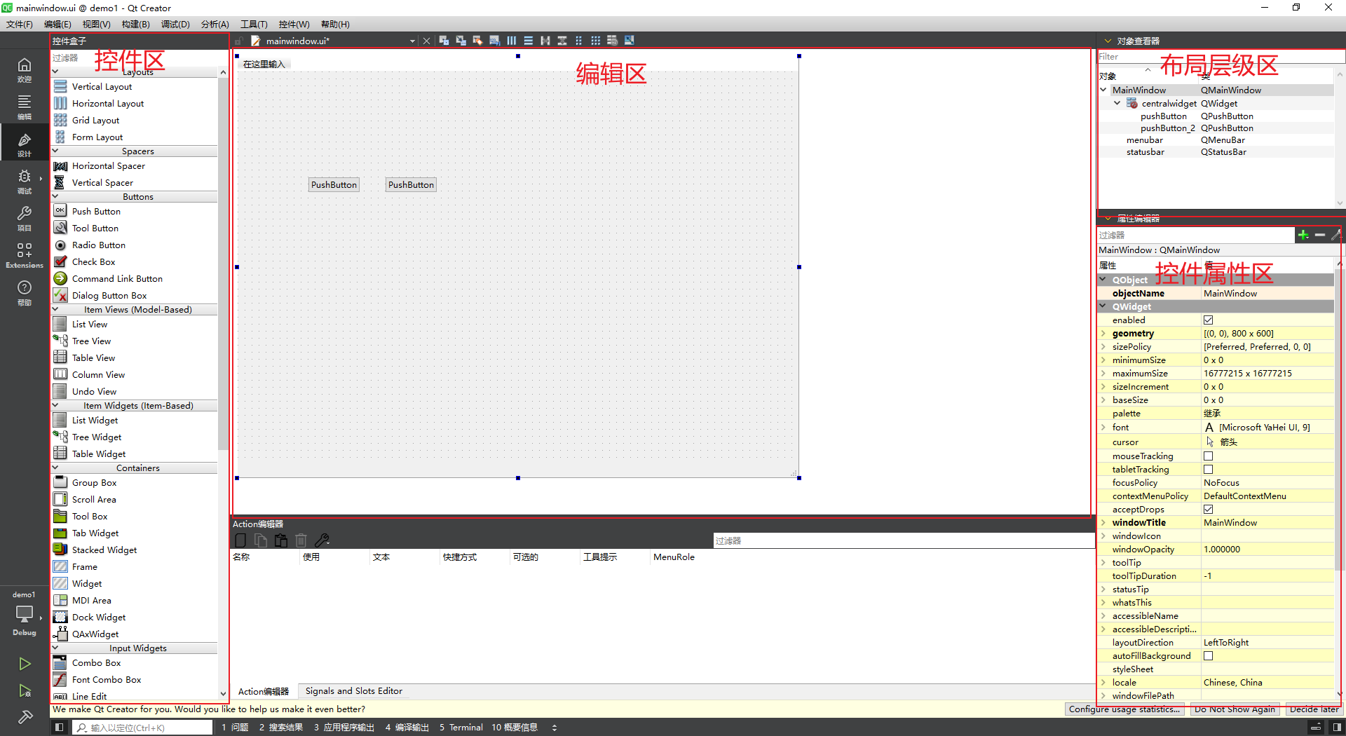 点击mainwindow.ui文件,可以进入窗口布局界面,可以从左边控区拖动控件到编辑区编辑界面,