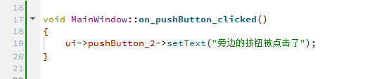 在函数里加上一句 ui->pushButton_2->setText("旁边的按钮被点击了");
