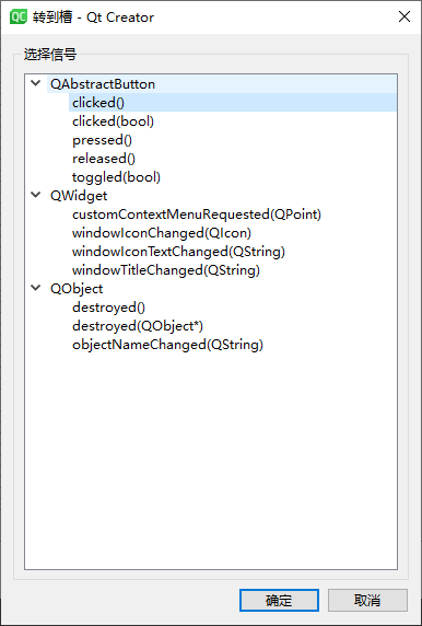 可以看到有几种信号,clicked点击,pressed按下,released释放等,选择clicked(),点击确定。
