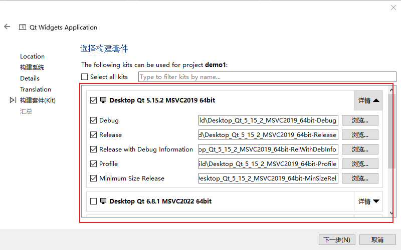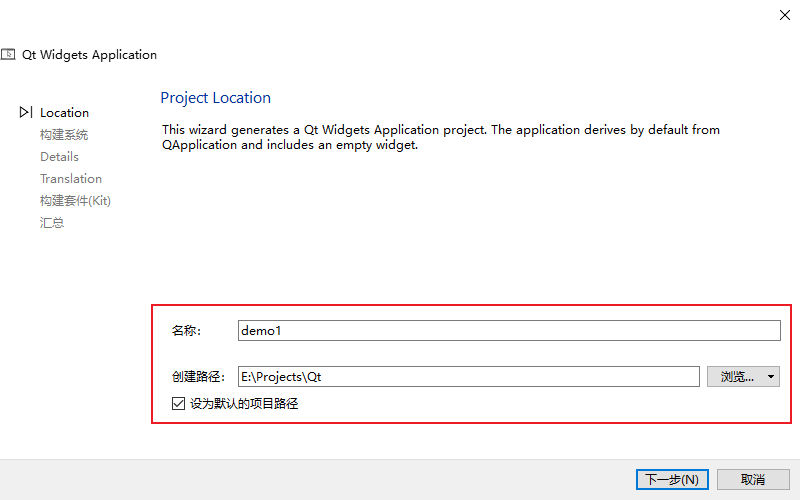 这里选择Qt5,所以选择Qt Widgets Application。填写工程名和路径。
