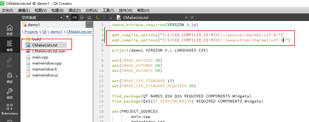 同时在CmakeLists.txt中加上,告诉编译器源代码时utf-8编码的,执行程序也是utf-8编码的,不然程序有中文会编译出错。