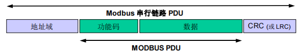 Modbus数据帧的第一字节是地址码,第二字节是功能码,中间是数据,最后两位是CRC校验码。
