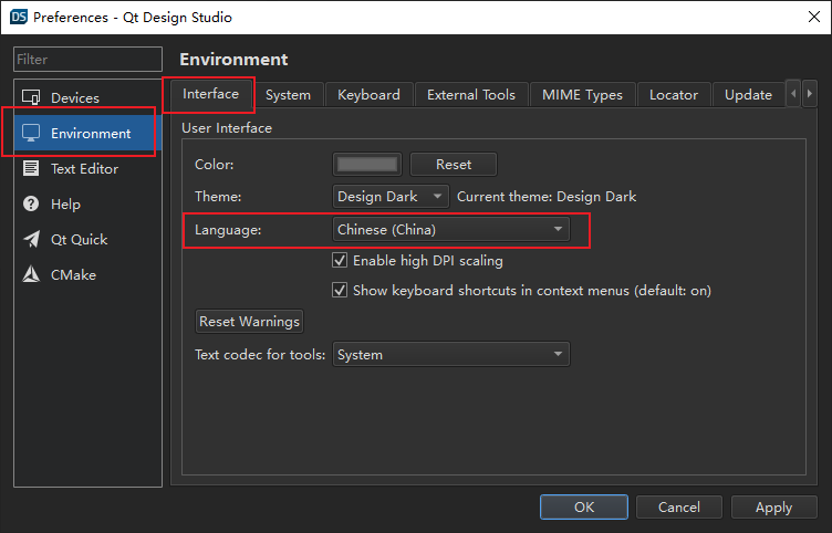 Qt Design Studio默认也属于英文界面,可以,在左上角菜单栏,找到Edit->Preferences,同样修改成为中文。