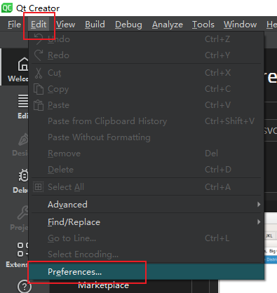 Qt Creator默认属于英文界面,可以,在左上角菜单栏,找到Edit->Preferences