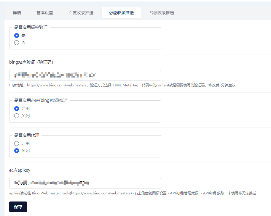 根据教程打开百度站长工具https://ziyuan.baidu.com/site/siteadd,注册登录账号。 根据需求填写网址,站点属性等,最后选择HTML标签验证,复制出来的验证码,填写到插件里点击保存。 稍等一下,刷新网站,到百度站长工具点击验证,验证成功后在搜索服务->普通搜录中获取token,保存到插件。 必应的更简单,基本在https://www.bing.com/webmasters登录账号,填写网址,html验证,获取token。填写保存 当站点发表文章时会自动推送。